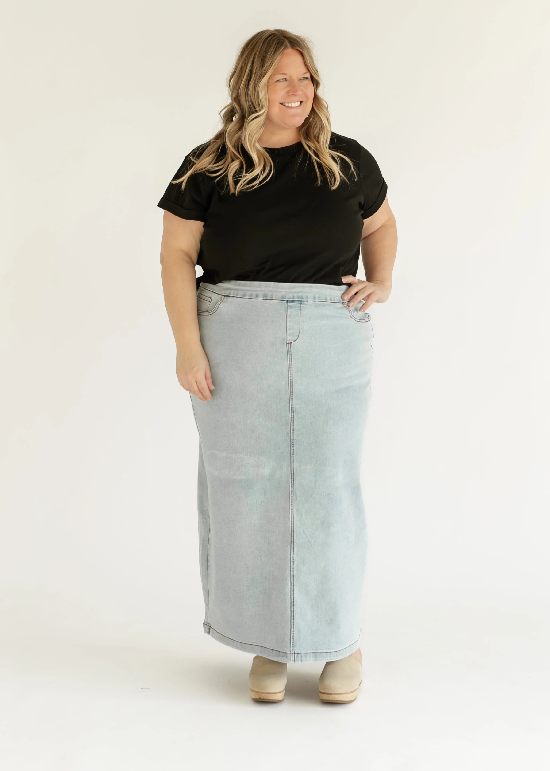 Donna Light Wash Maxi Denim Skirt is a timeless modest denim maxi skirt crafted from soft, stretchy fabric that moves with you in comfort and confidence. The flexible elastic waistband offers a forgiving fit that adapts beautifully through life’s natural changes, while functional pockets and a light wash make it an everyday essential. Style with flowy blouses or knit sweaters for church and daily wear.