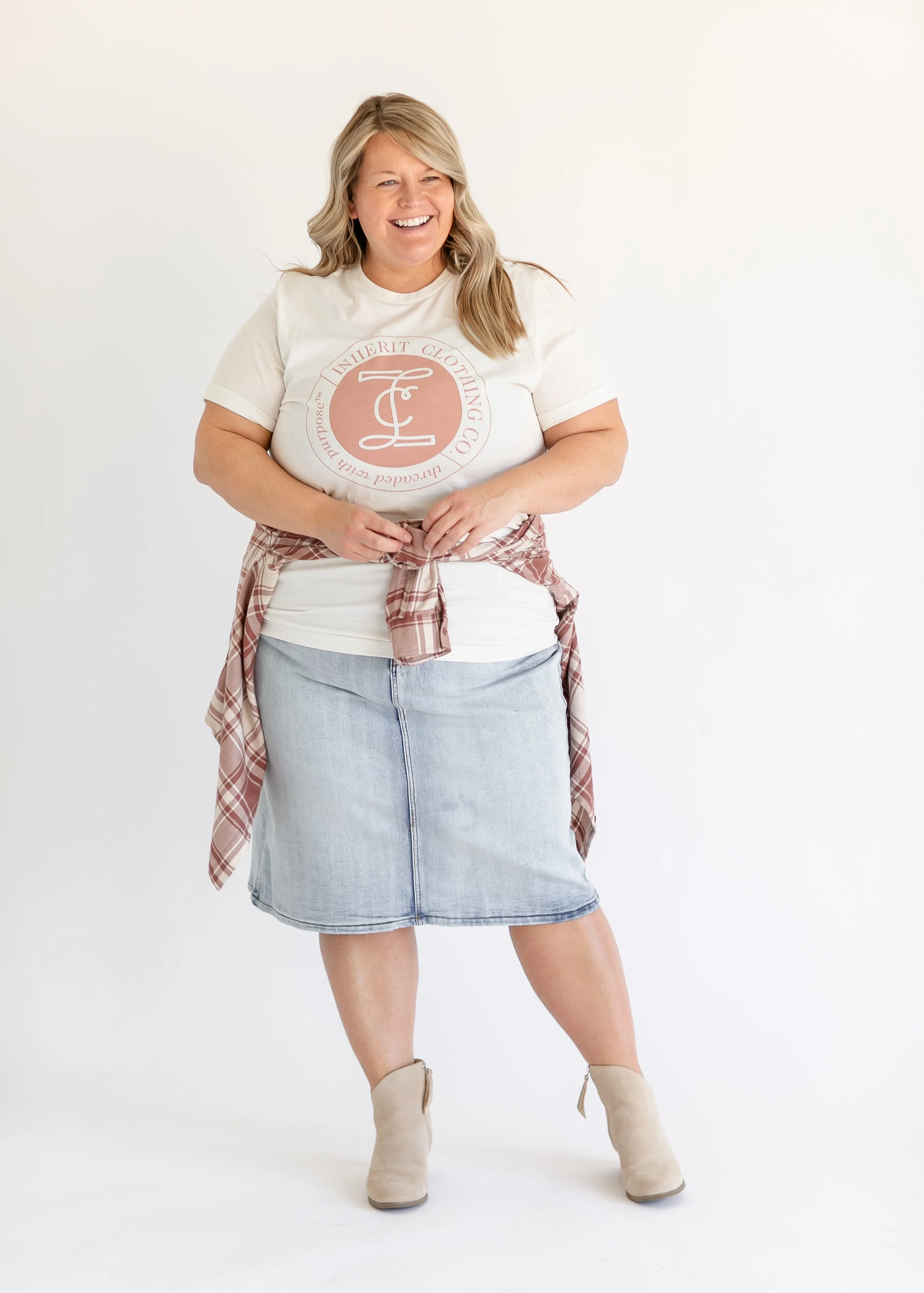 Represent your favorite company with the Inherit Threaded with Purpose Graphic T-shirt! Designed with our IC thread logo circled by the words "Inherit Clothing Co." and our mission statement "Threaded with Purpose". All in a modest feminine t-shirt fit, with a classic crewneck and short sleeves. It is available in sizes XS-2XL and two color options charcoal and cream with an Inherit blush graphic. Pair this t-shirt with your favorite Inherit Designed denim for a look that is truly Threaded with Purpose™!