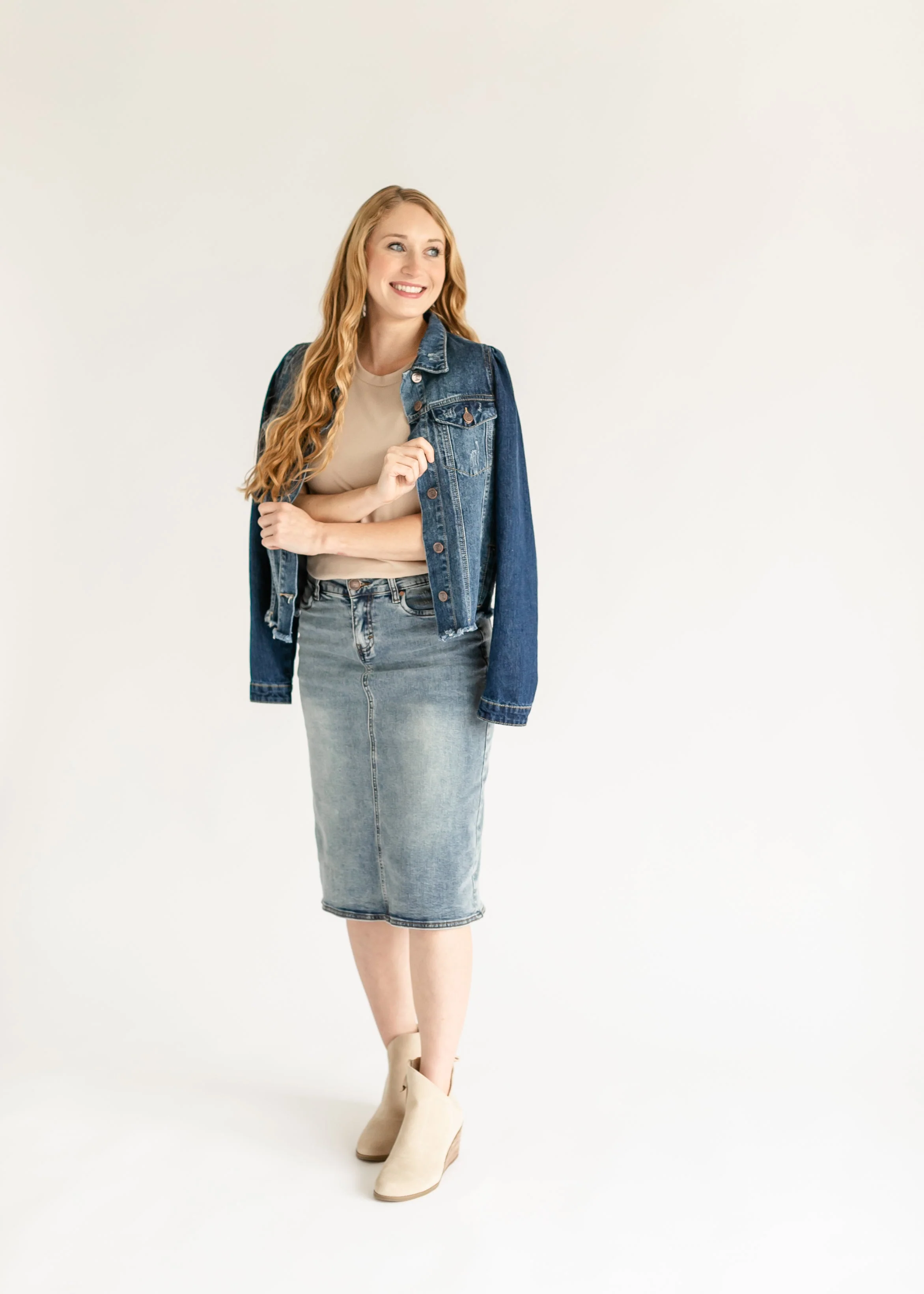 The Kaitty Vintage Wash Midi Skirt is an Inherit Design tailored in a straight fit with amazing details. Made with a vintage wash it has an IC embroidered logo on the back pocket in the corner, criss-cross belt loops in the back, and is super stretchy! There is a small back slit for maximum walkability! You're going to love styling this every which way for any season as this skirt will certainly be a wardrobe staple!