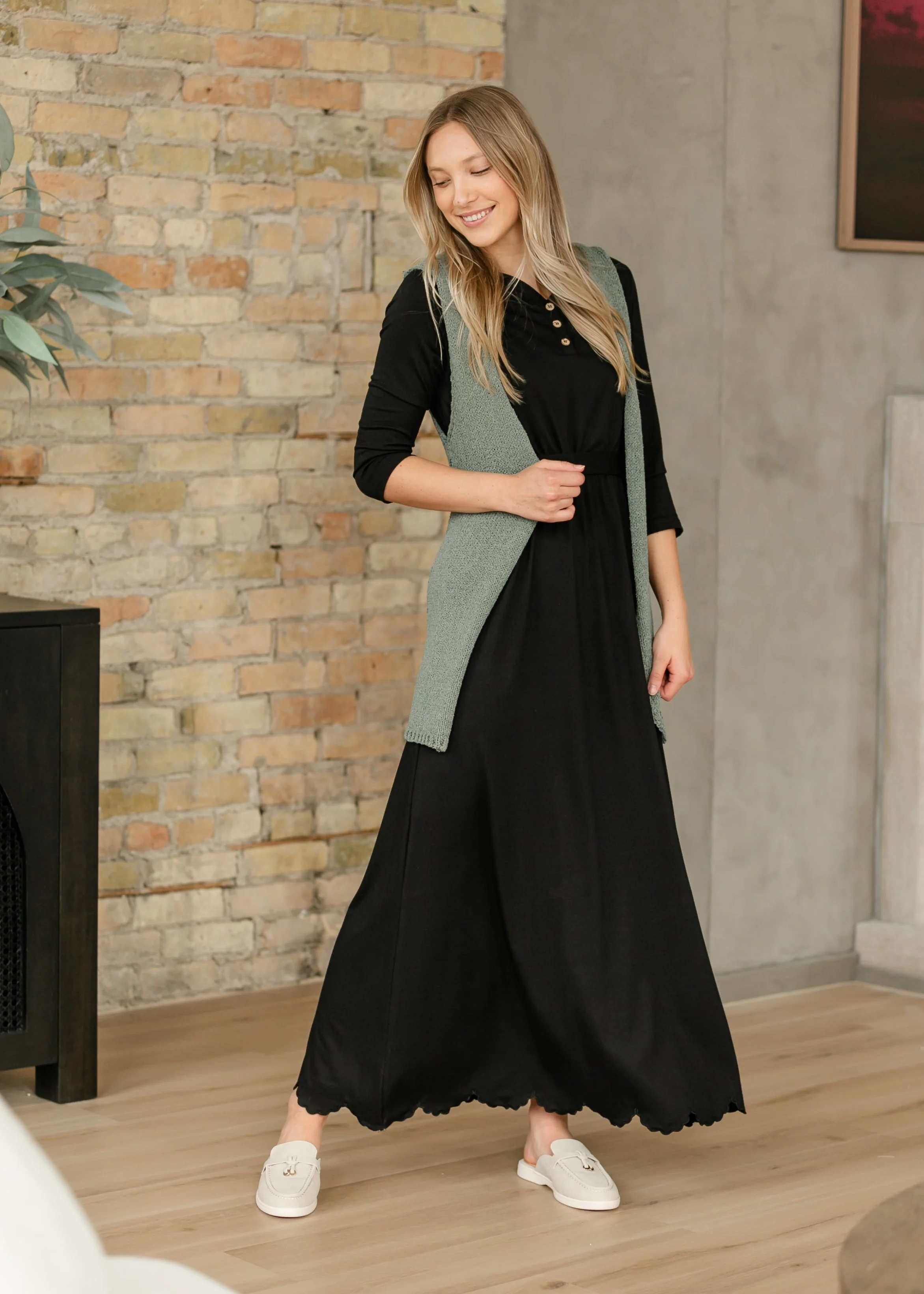Look no further, the Lydia Button Front Maxi Dress is just as functional as it is beautiful! This tri-blend dress is oh-so soft and extremely comfortable with its elastic waist, partial lining and the matching fabric belt. The simple wood buttons are fully functional and the neckline features a feminine that also compliments the scallop hem. This is a stand alone dress but could easily be paired with a cozy cardigan or jean jacket!