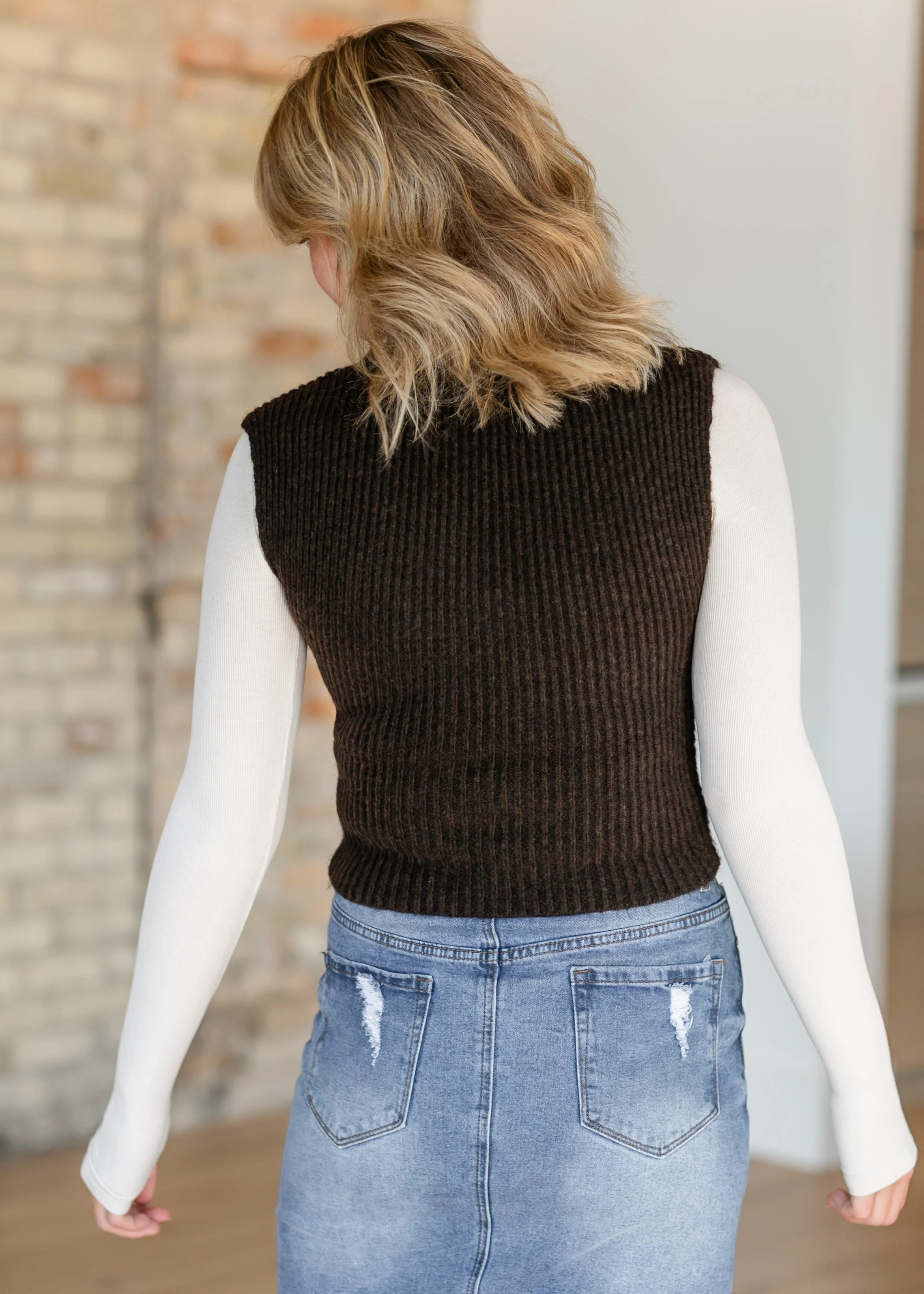The Steve Madden® Jaylin Sleeveless Brown Sweater is a modest sleeveless, ribbed knit top is designed for effortless style with a modern twist! The rich charcoal brown hue is complemented by the unique asymmetrical seam across the front, adding a sleek and flattering structure to the piece. Perfect for layering the soft knit fabric ensures both comfort and style!